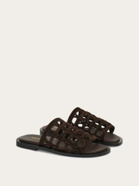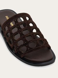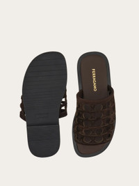Starring the iconic Gancini, this new sandal embodies the craft for which Ferragamo is best known. A marriage of heritage craftsmanship and contemporary style, the upper band of this easy slip on features the Cage of Ganci, a prominent pattern in this season's runway show. The padded, slightly squared sole completes the design. - Composition: calfskin suede - Made in ITALY - Product code: 029925 782447