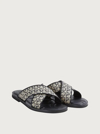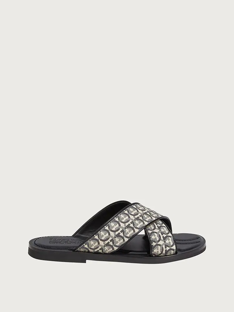 This sandal with wide cross over straps and minimal lines has a full on summer feel. The Gancini pattern woven into the jacquard fabric combines wonderfully with the leather interior and padded insole with personalized stitching. This informal summer shoe has a soft leather sole. - Composition: fabric and calf leather - Made In ITALY