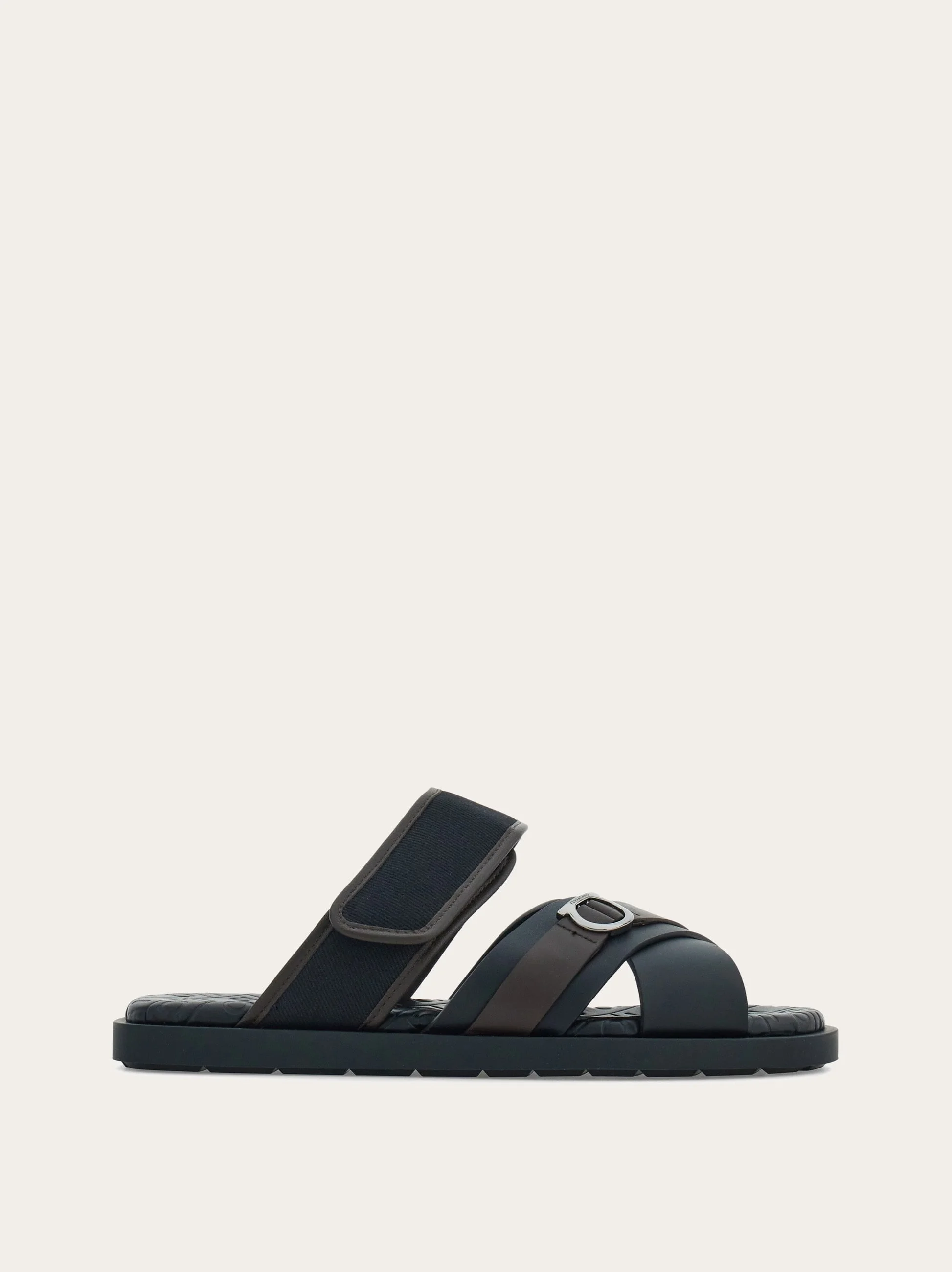 This summer sandal features crossover front straps securing the toes and an adjustable velcro strap across the instep. Notice the luxe insole embossed with the Ferragamo Monogram pattern and the titanium-tone Gancini detail positioned discreetly on the side. Rubber sole with custom tread. - Composition: calfskin and fabric - Made in ITALY - Product code: 029918 782399