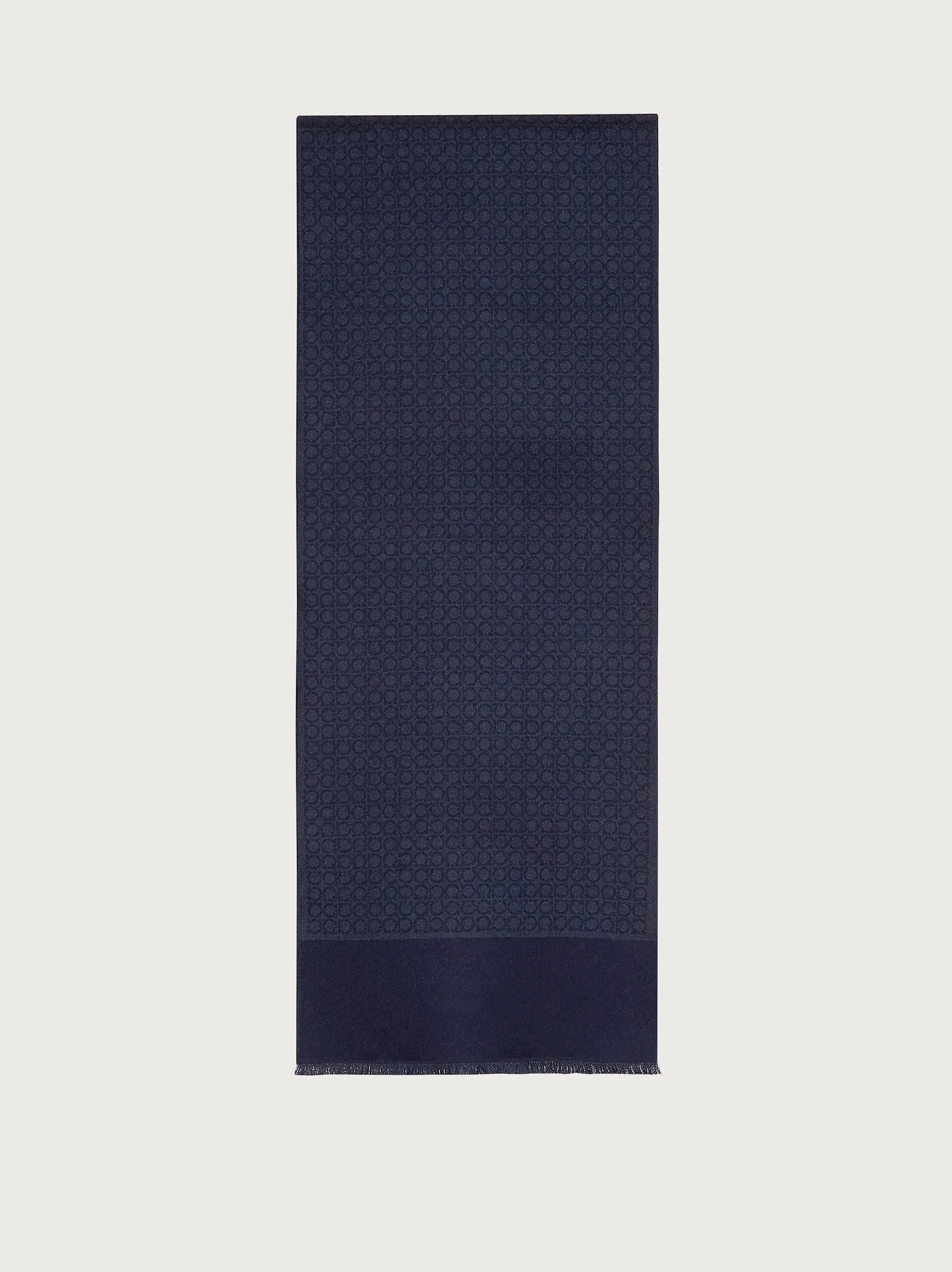 This pure wool scarf decorated with an all over Gancini pattern has an elegant look and iconic details. Contrasting color block borders and small fringe add a modern touch. Ideal with formal looks or sophisticated workwear. - length 12.9 IN width 70.8 IN - Composition: 100% wool - Made in ITALY - Product code: 527047 671682