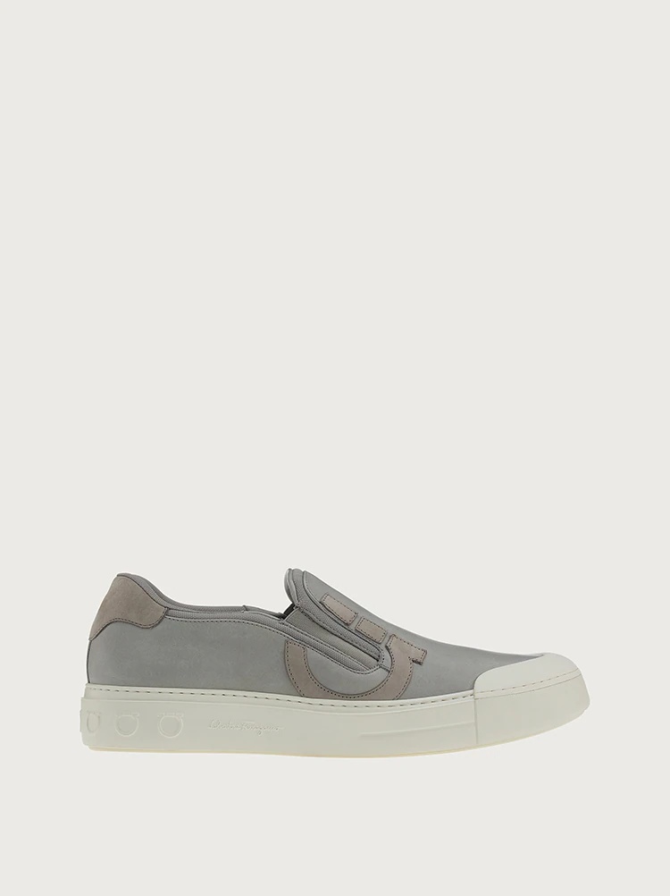 The perfect casual slip on for off duty wear, these new sporty sneakers combine a sporty spirit with a luxurious heart. The upper, in soft calf leather, has contrasting elastic inserts enveloped by a Gancini outline. The construction is flawless, with an ultra-light rubber sole and knurled tread. - Composition: calf leather and nubuck - Made In ITALY