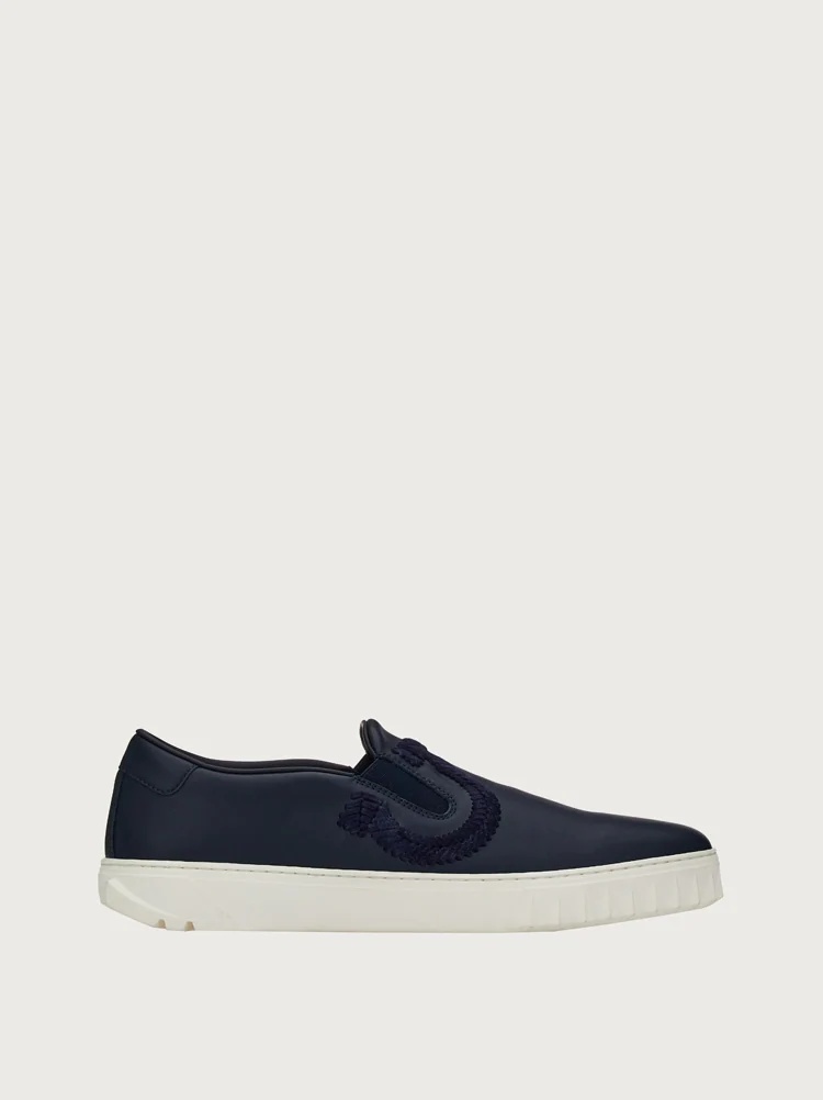 A cool street shoe with a casual appeal and iconic details, this slip on sneaker is ideal for off duty days. The exclusive saddle calf leather goes through a chrome-free tanning process, and is tumbled in drums to obtain a beautiful finish, accentuated by the leather embroidered Gancio silhouette on the upper right side. The ultra-light rubber sole has a shark tooth effect around the tip which leads to a circular support under the ball of the foot, guaranteeing absolute comfort in a key pressure point. They really did think of everything! - Composition: calf leather - Made In ITALY