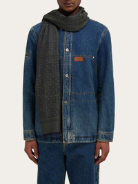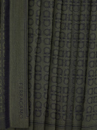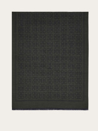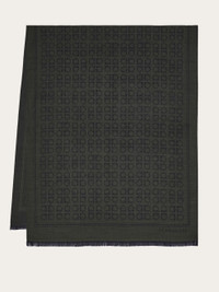 Subtle and extremely sophisticated, this pure wool and silk shawl is covered in a geometric pattern of the iconic Gancini. A tonal frame completes the design with fringed edges and tonal logo in the bottom corner. - length 70.8 IN width 27.5 IN - Composition: 90% pure virgin wool, 10% silk - Made in ITALY - Product code: 520144 785250
