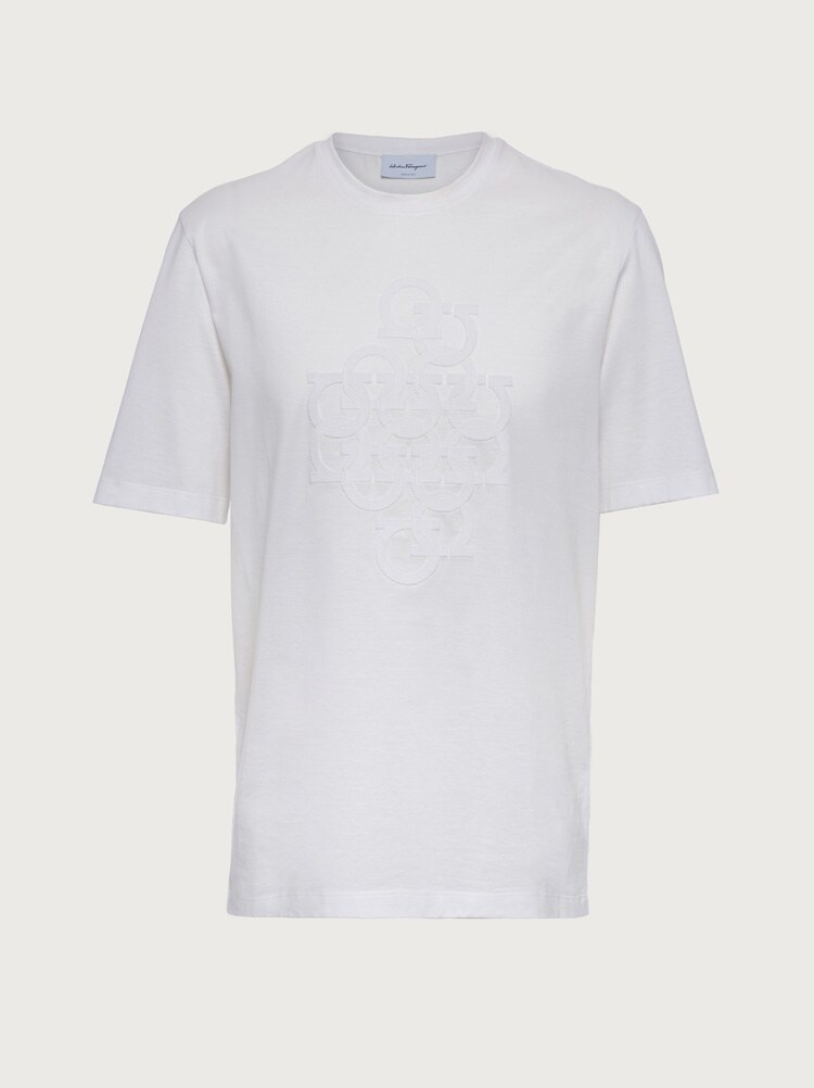 Has there ever been a time when a plain white tee wasn’t the coolest solution to any wardrobe dilemma? The perfect go to for so many looks, this pure organic cotton shirt, produced without chemicals, has a round neck, short sleeves and a tonal multi Gancio embroidery on the front. Logo label made from 100% post-consumer recycled polyester. - Composition: 100% cotton - Made In ITALY