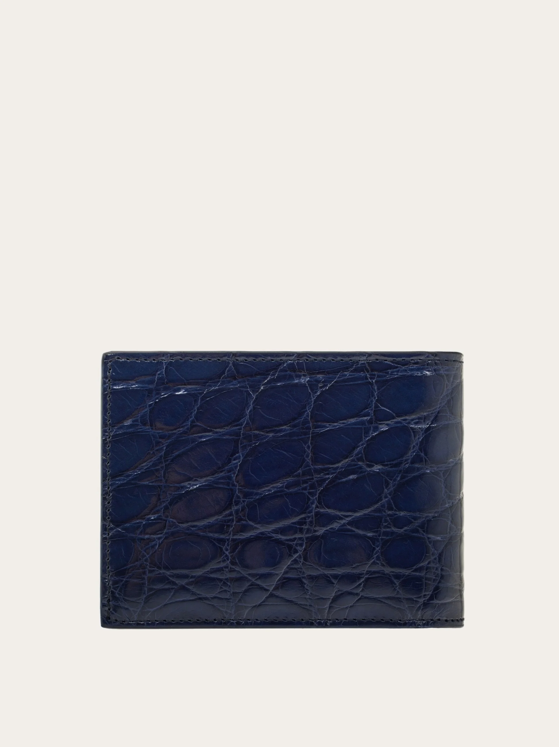 With its outer panels in alligator leather, this new Ferragamo wallet has a decidedly luxurious look, echoed by the burnished Gancio applied to the bottom corner. Inside, the calfskin lining has several card slots, and a large slot for banknotes. - height 3.3 IN length 4.3 IN - Composition: alligator - Made in ITALY - Product code: 661451 776978