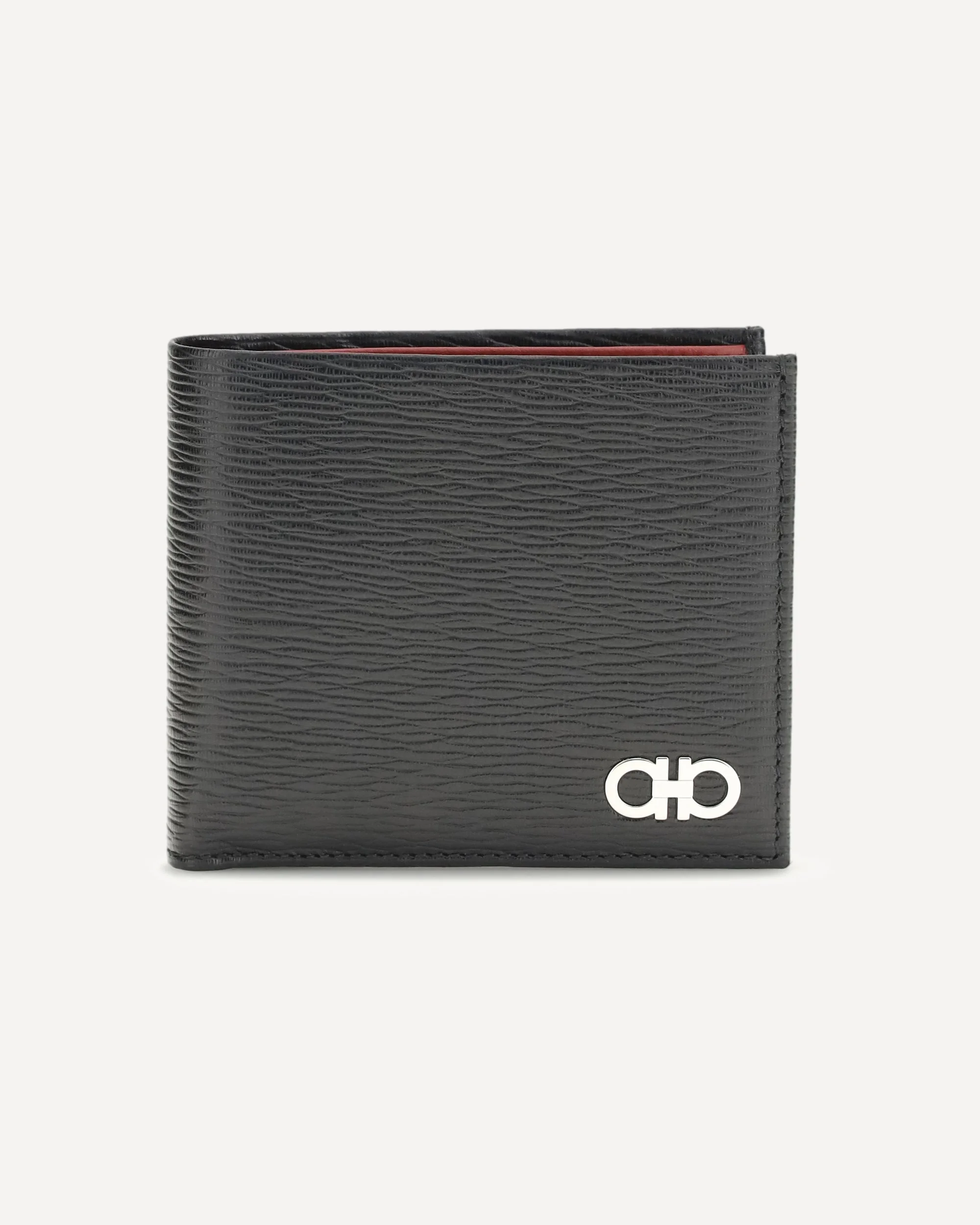 The Gancini Wallet by Ferragamo is crafted from hammered calfskin with a contrasting smooth interior, combining elegance and functionality. The interior is organized with compartments for bills, slots for credit cards, flat pockets, and a buttoned pocket for coins. The shiny metal Gancini detail on the front adds a distinctive and discreet touch to the design. DETAILS - Sku: 685986_007 - Season: SS26 - Dimension: 11.5x9.5 - Composition: GENERAL 100% Calf Leather Bos Taurus - MADE IN ITALY