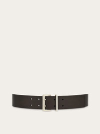 New contemporary design belt with a 4.5 cm height for a bold look. Crafted with a fixed length, it features a semi-gloss calfskin strap and a geometric buckle in satin-finish palladium with a double prong. A small raised Gancini on the corner of the buckle completes the design. - Composition: calfskin - Made in ITALY - Product code: 670403 777442
