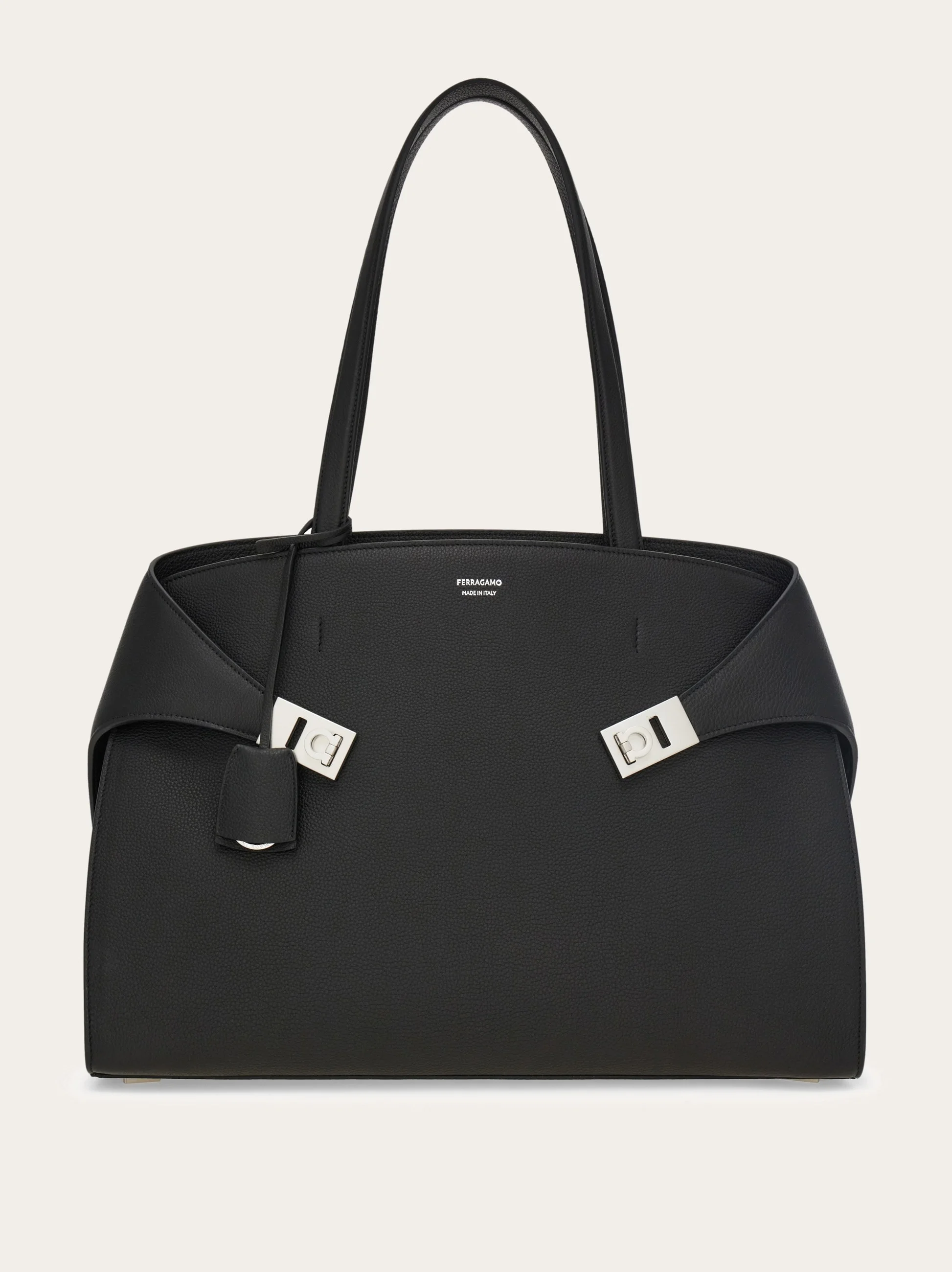 Generous proportions and sleek lines define this new version of the Hug shoulder bag, crafted from grained calfskin. The signature wraparound sides fasten at the front with satin palladium-finish buckles and are accented by a keychain charm with a covered ring. The interior is fully lined and spacious enough to hold personal items and electronic devices. The top handles can be tucked inside, allowing the bag to be worn as an oversized clutch. A detachable long strap offers an additional styling option. - height 12.2 IN length 17.7 IN width 6.1 IN - Composition: hammered calfskin - Made in ITALY - Product code: 241813 787660