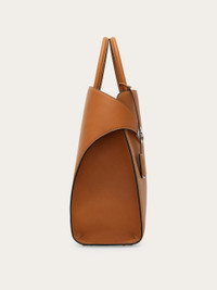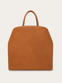 Since its launch the Ferragamo hug bag has become a contemporary icon. The latest iteration in sumptuous nappa leather is luxurious and spacious. Faithful to the original silhouette, it has an asymmetrical back panel that wraps around to ‘hug’ the front one via two wide leather straps with custom Gancini clasps. The lined interior features a zip pocket, and a tonal leather fob is placed on the rigid top handle. Rectangular foot studs provide protection and confirm his iconic status. A removable leather strap offers hands-free style. - height 15.3 IN length 14.9 IN width 5.9 IN - Composition: nappa - Made in ITALY - Product code: 241666 789646