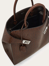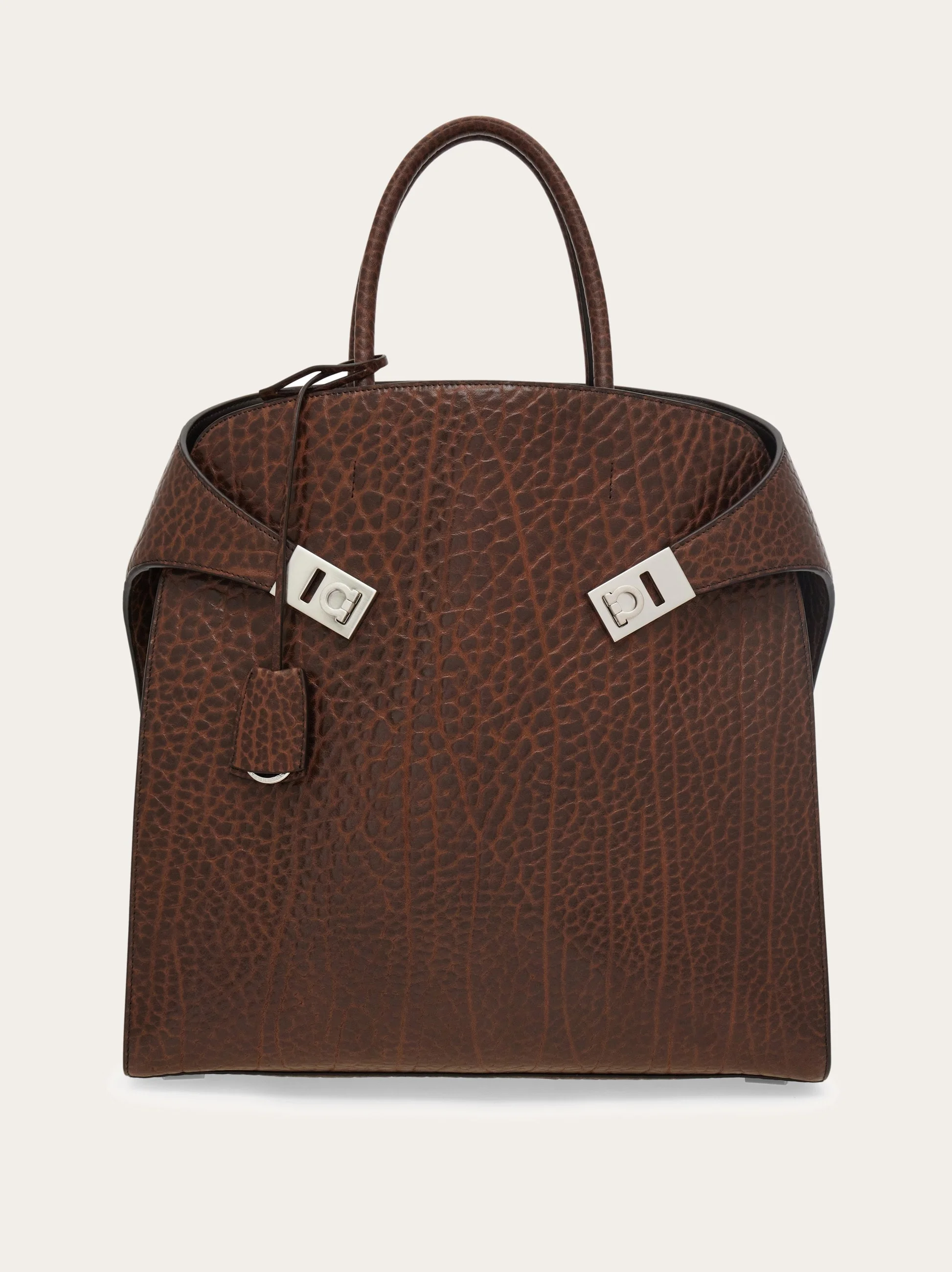 The Hug tote bag gets a masculine update with generous proportions and panels crafted from new washed calfskin with a pronounced grain. Signature construction details remain, including wraparound side bands, palladium-finish Gancini buckles, and a keychain charm. The interior is smartly organized to hold personal items or electronic devices. Designed to be carried by hand or over the shoulder with a removable leather strap. - height 15.3 IN length 14.9 IN width 5.9 IN - Composition: washed calfskin - Made in ITALY - Product code: 241666 787857