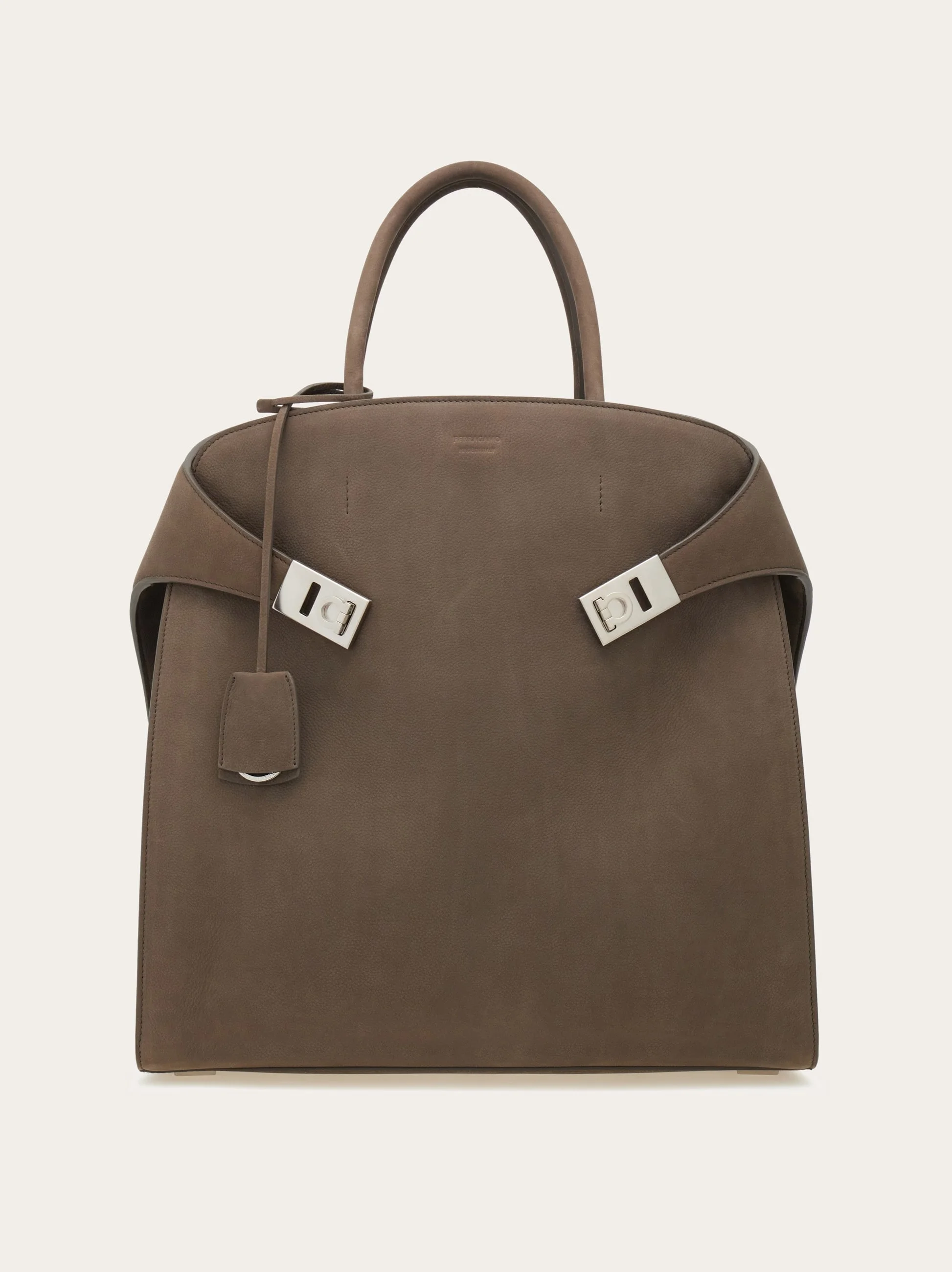 Since its launch the Ferragamo hug bag has become a contemporary icon. This gentlemen's iteration in hammered calfskin is luxurious and spacious. Faithful to the original silhouette, it has an asymmetrical back panel that wraps around to ‘hug’ the front one via two wide straps with custom Gancini clasps. The lined interior features a zip pocket, and a tonal leather fob is placed on the rigid top handle. Rectangular foot studs protect the base and confirm his iconic status. A removable leather strap offers hands-free style. - height 15.3 IN length 14.9 IN width 5.9 IN - Composition: nubuck - Made in ITALY - Product code: 241666 782576