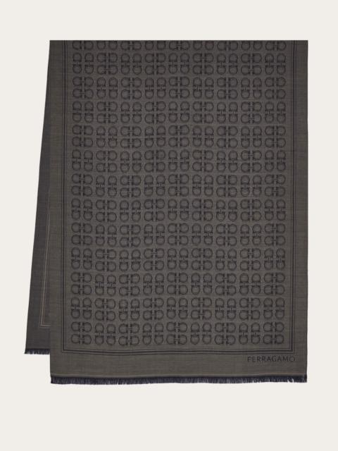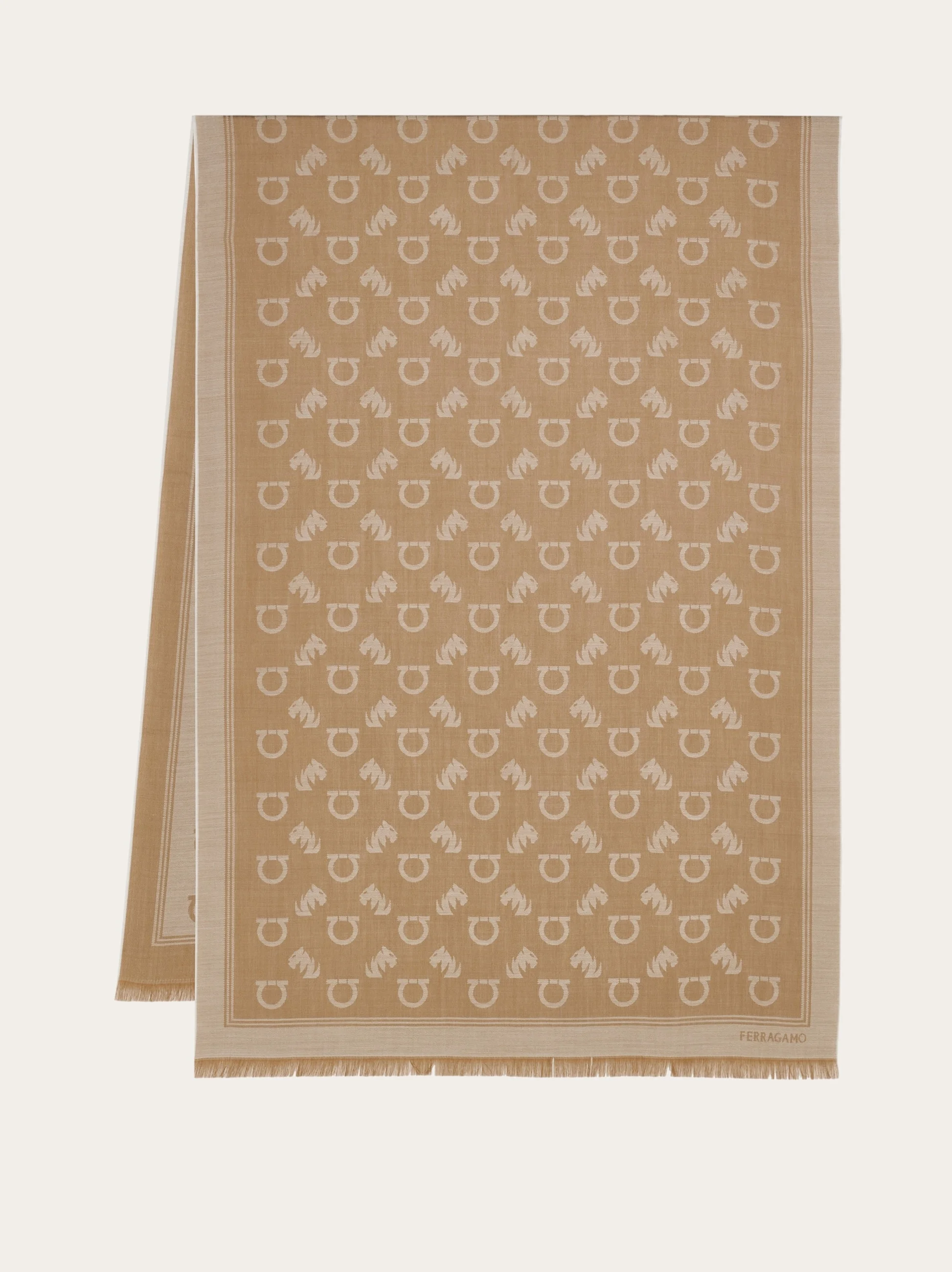 The stylized squiggle on this jacquard stole draws a feline figure. Interspersed with Gancini symbols, the regal pattern is encased by a tonal frame. - length 80.7 IN width 27.5 IN - Composition: 61% lyocell, 27% pure virgin wool, 12% silk - Made in ITALY - Product code: 520141 785236