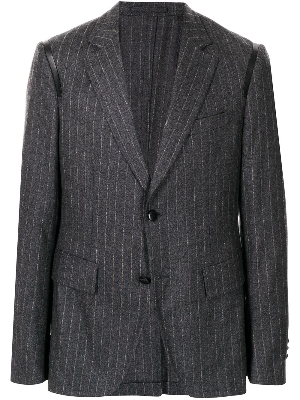 leather-trim suit jacket grey virgin wool pinstripe print leather trim front button fastening front flap pockets chest welt pocket long sleeves buttoned cuffs central rear vent straight hem Made in Italy Composition Virgin Wool 100% SIZE & FIT Model measurements Height 6 ft 0 in(1.83 m) Bust/Chest 37.79 in(96 cm) Hips 37 in(94 cm) Waist 30.31 in(77 cm) FittingInformation This piece fits true to size. We recommend you get your regular size Cut for a slim fit Made with a mid-weight non-stretch fabric Washing instructions Do Not Wash/Do Not Dry Clean