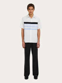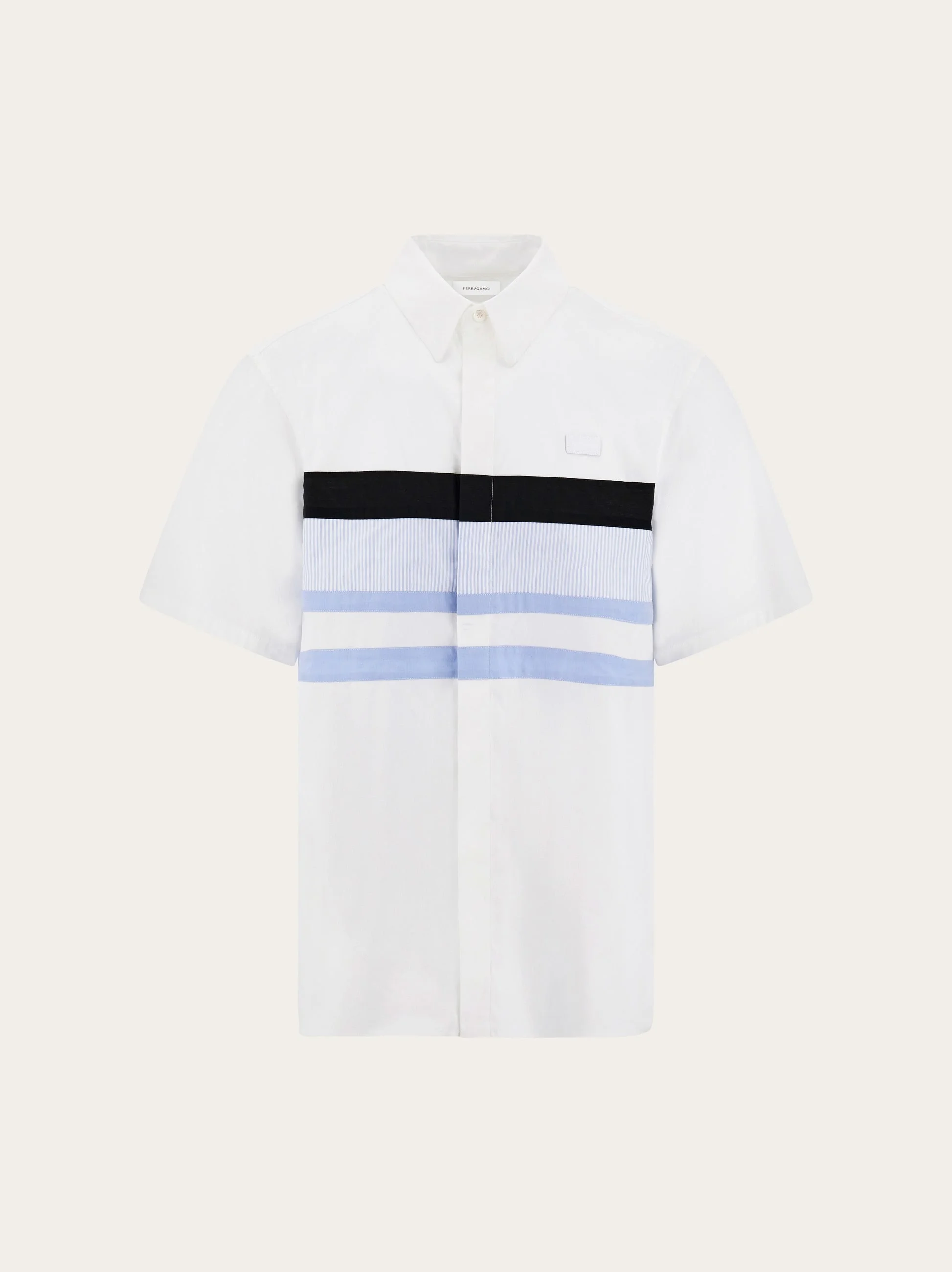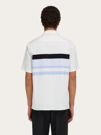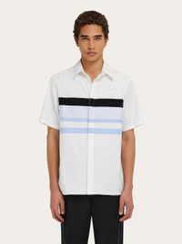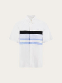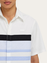 The patch detail across the chest of this bowling shirt is created from cuts of leftover cotton, giving a second life to new designs. Playful yet sophisticated, the sporty construction includes a rubberized logo tab on the chest, open collar, and a concealed placket. - Composition: 78% cotton, 17% polyamide, 5% elastane - Made in ITALY - Product code: 144815 785094