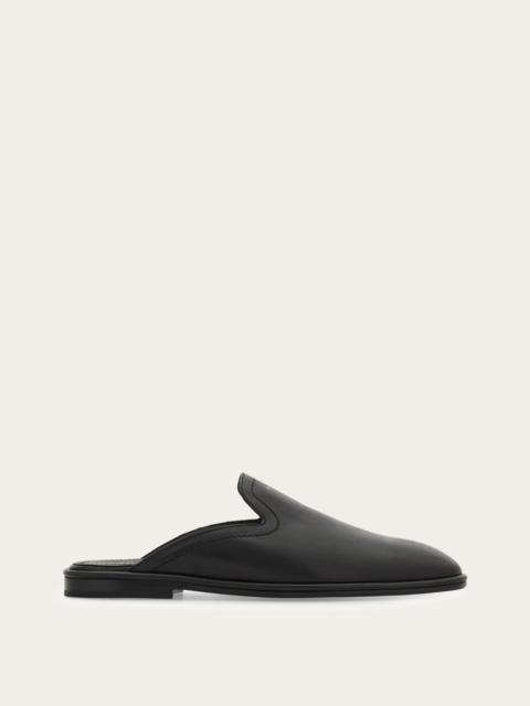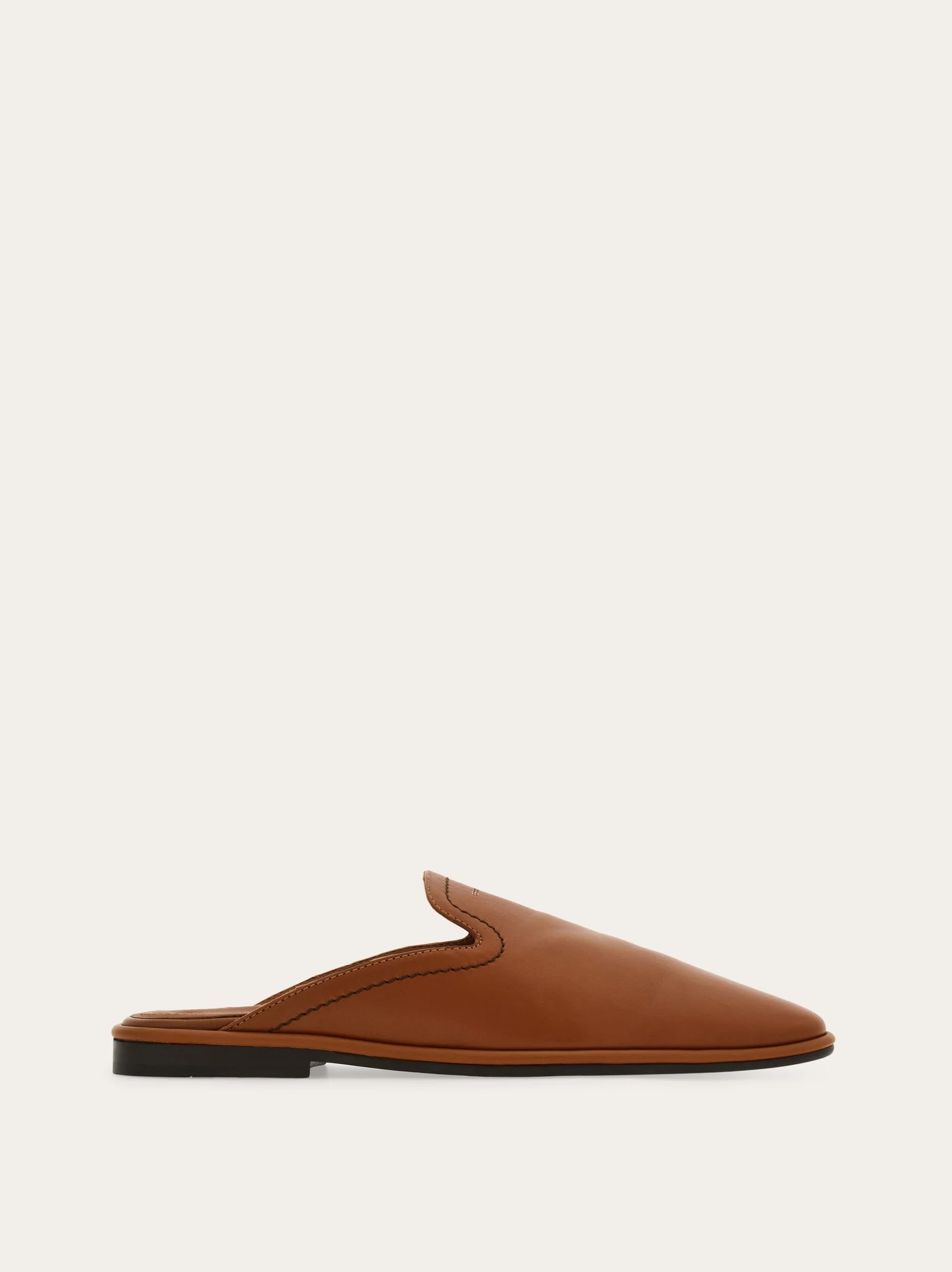 Laid back lightweight mule whose decidedly high end feel is confirmed by the golden branding embossed on the tongue. The clean silhouette emphasizes the supple texture of the leather, with double stitched trims for a contemporary edge. Leather sole with rubber island. - Composition: calfskin - Made in ITALY - Product code: 02A767 792858