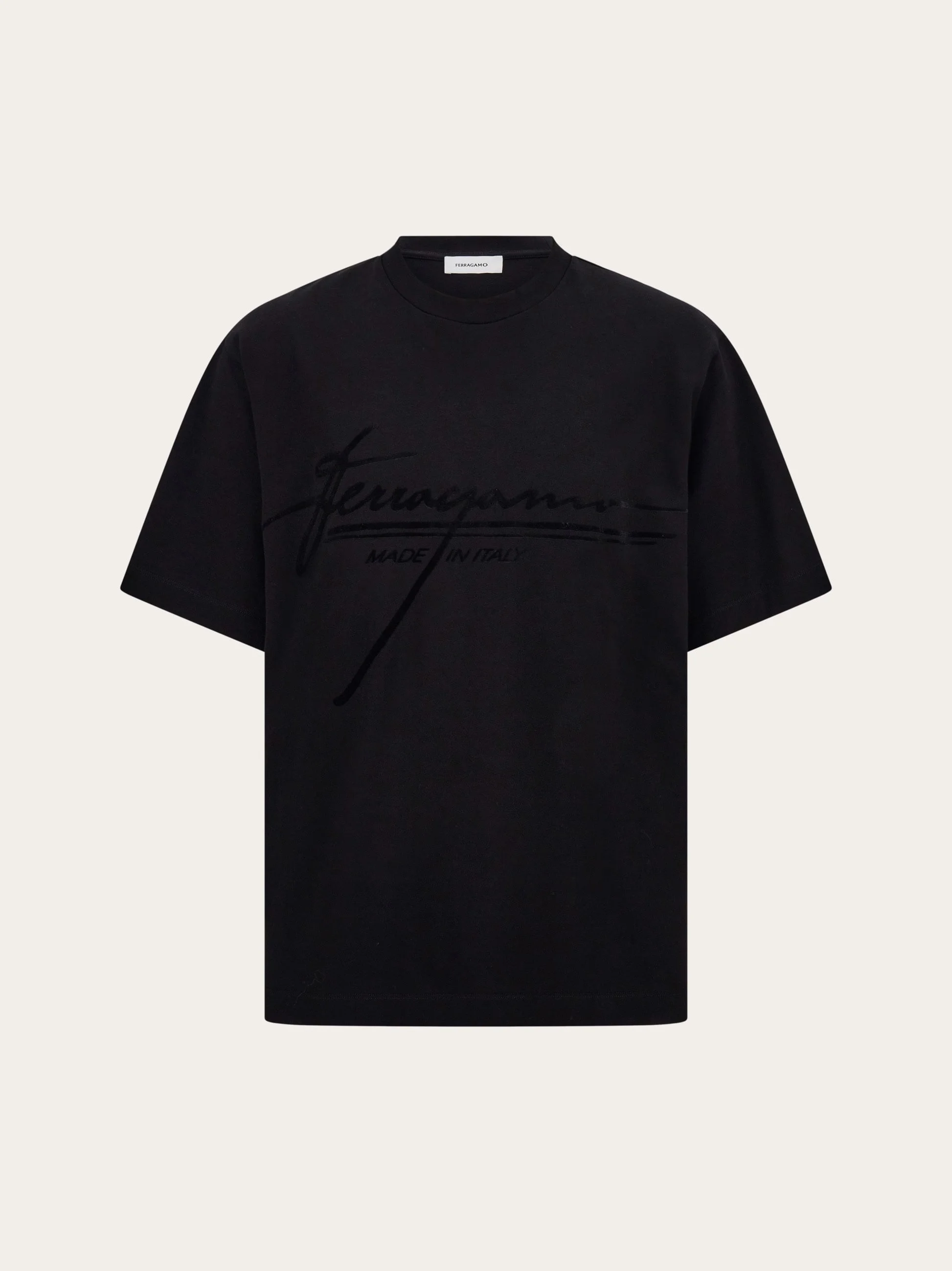 Signed, sealed and delivered by Ferragamo. This pure cotton tee features a classic crew neck, and flock cotton macro signature with a velvety texture. Regular fit. - Composition: 100% cotton - Made in ITALY - Product code: 144859 786885