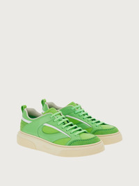 An array of textures and cut outs add a futuristic flavor to this 90's inspired sneaker with suede inserts. The leather upper features a reinforced toe and heel and tonal laces. Tonal cassette sole with Ferragamo signature. - Composition: calfskin and suede - Made In ITALY