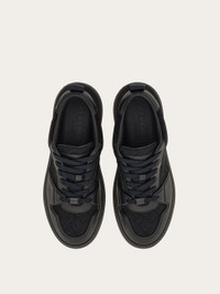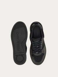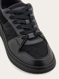 A chic take on the Ferragamo low-top sneakers featuring a plain calfskin upper, complemented by jacquard fabric inlay with a custom pattern. The 90s-inspired lines boast a reinforced heel and toe and laces decorated by a tonal tag. Ultra-lightweight rubber box sole with shaping on the side and the embossed logo on the heel. - Composition: calfskin and fabric - Made in ITALY - Product code: 028683 775744