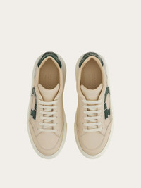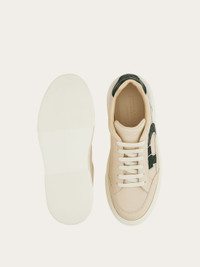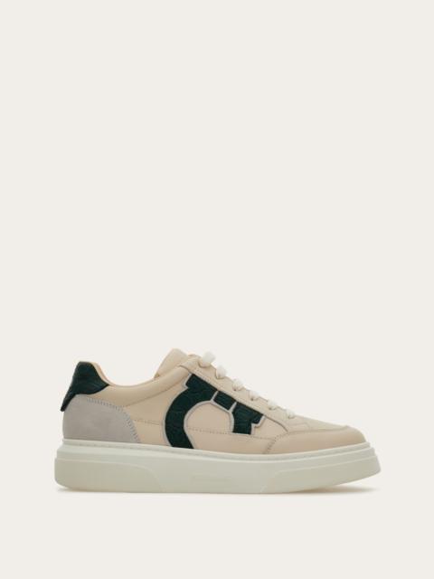 This low-top sneaker draws inspiration from 90s basketball styles. The smooth leather upper is elevated by luxurious alligator skin accents: the signature Gancini motif on the side and matching heel tab. Rubber sole with textured edges and custom tread. - Composition: calfskin and alligator skin - Made in ITALY - Product code: 02A120 787091