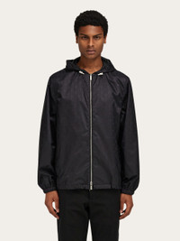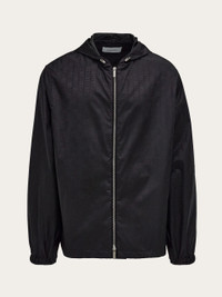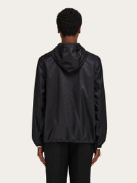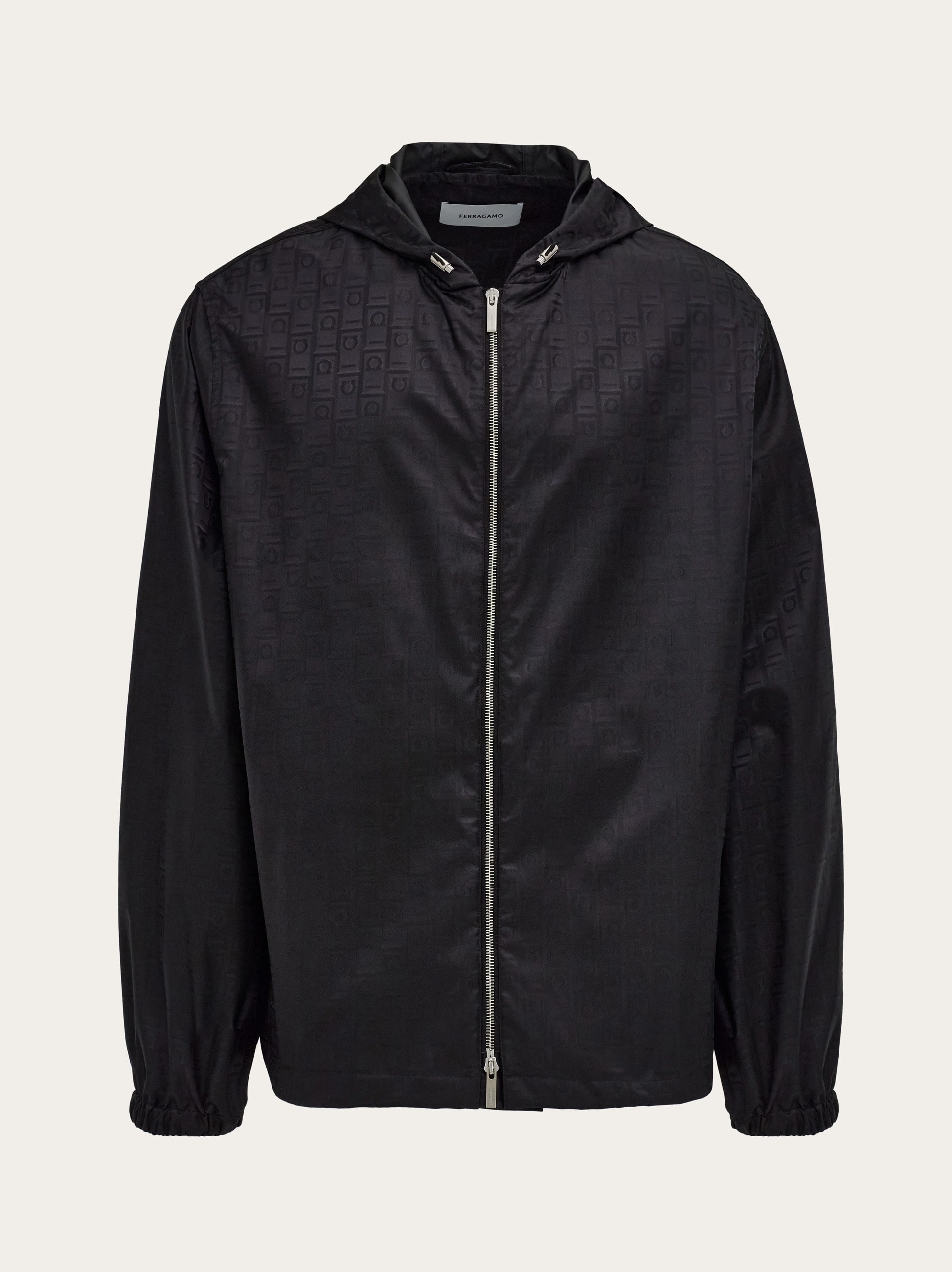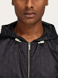 Lightweight windbreaker in recycled nylon, showcasing an all-over, tone on tone Ferragamo Monogram motif and coated finish. Ideal for urban adventures, it's detailed with zipped welt pockets and a two way front zip closure. The spacious hood and cuffs can be tightened with drawstrings and customized metal stoppers. - Composition: 100% polyamide - Made in ITALY - Product code: 144354 780757