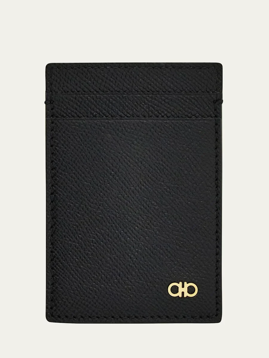 Ferragamo card case in hammered calf leather highlighted with micro Gancio hardware Goldtone money clip Foiled logo on the back Two card slots Approx. 7.2"H x 4.1"W Made in Italy