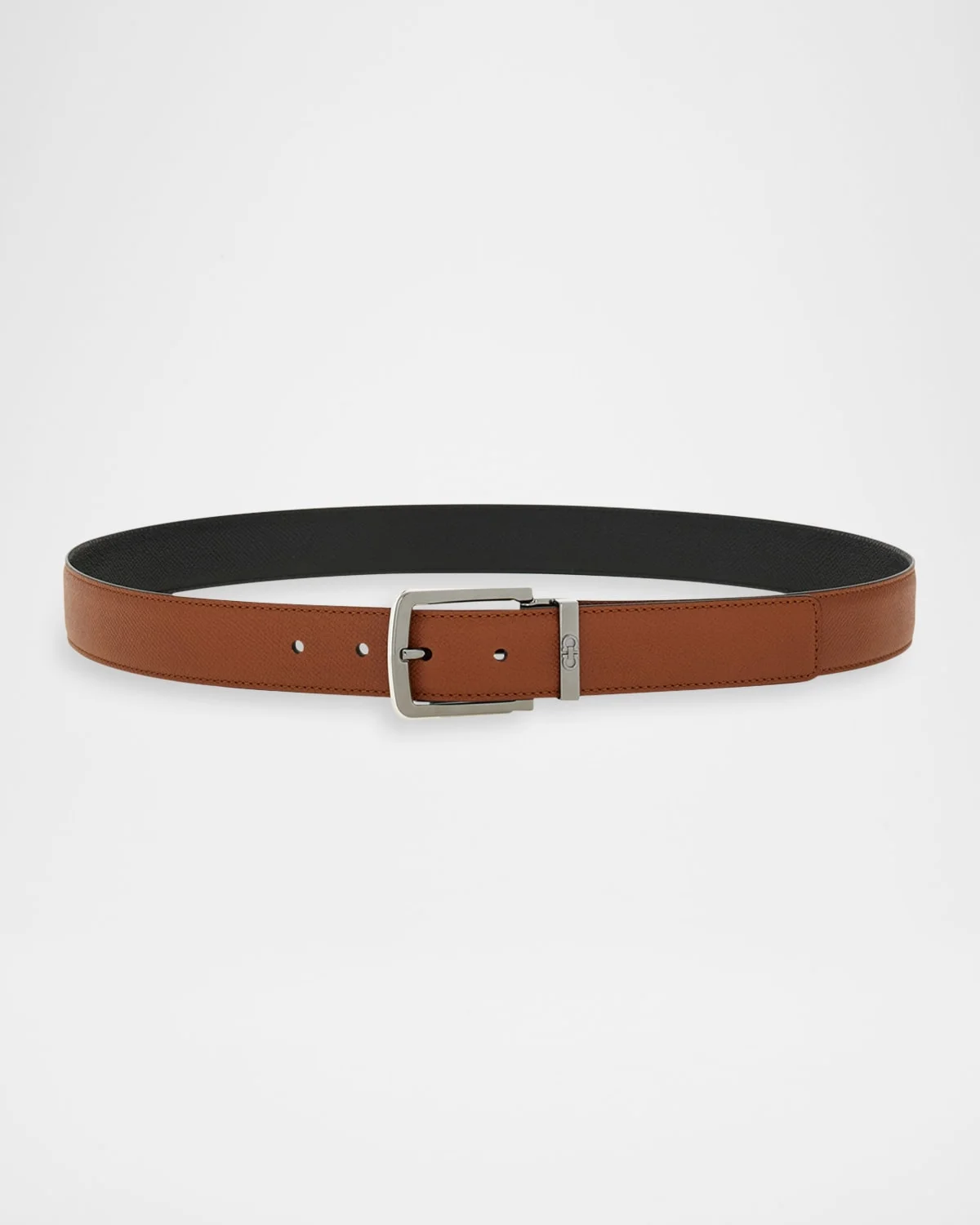 Ferragamo reversible belt in smooth leather defined by a Gancini metal belt keeper Approx. 1.3"W Rectangular pin buckle The adjustable length allows for a more personalized fit and style. Easily cut the belt strap or punch another hole for a tighter or looser fit. Leather Made in Italy