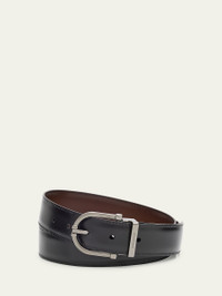 Ferragamo reversible belt in smooth calf leather defined by a curved pin buckle Approx. 1.26"W Logo-engraved belt keeper The adjustable length allows for a more personalized fit and style. Easily cut the belt strap or punch another hole for a tighter or looser fit. Leather Made in Italy Online Inquiries: BGS21_NCZ52| Store Inquiries: #4979436