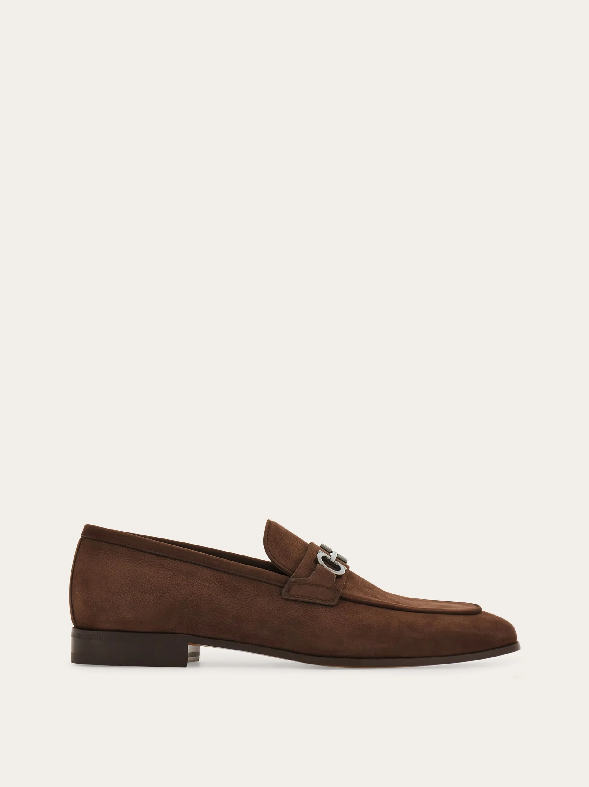 Ideal for workwear or uptown city looks, this new Ferragamo loafer has an elongated silhouette with a slightly squared tip. Visible stitching around the tray complements the elegant Gancio bit in a titanium finish at the side of the saddle strap. Red stitching and a flexible leather sole confirm a high-end shoe with a sophisticated flair. - Composition: nubuck - Made in ITALY - Product code: 029268 792747