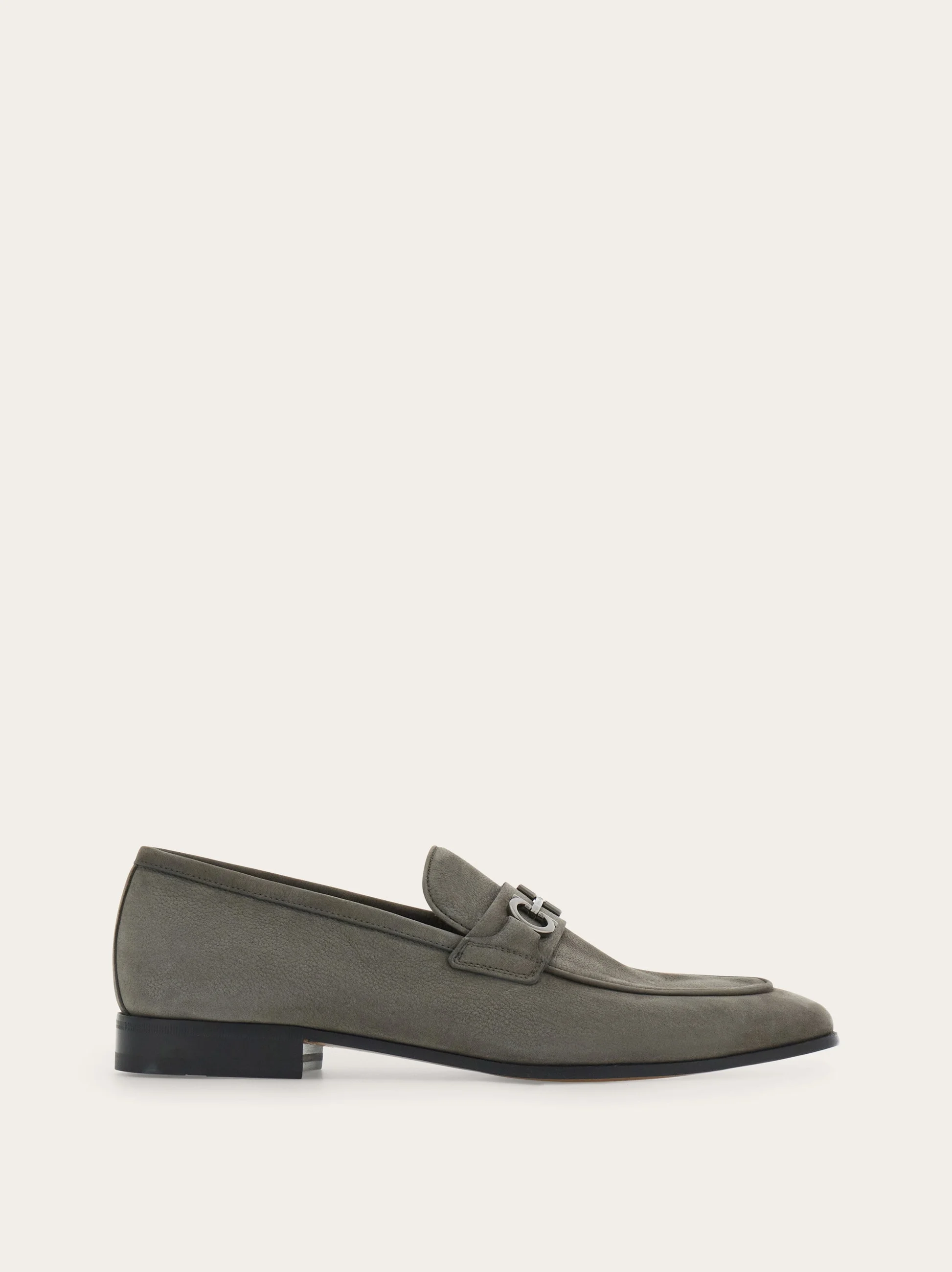 Ideal for workwear or uptown city looks, this new Ferragamo loafer has an elongated silhouette with a slightly squared tip. Visible stitching around the tray complements the elegant Gancio bit in a titanium finish at the side of the saddle strap. Red stitching and a flexible leather sole confirm a high-end shoe with a sophisticated flair. - Composition: nubuck - Made in ITALY - Product code: 029268 792749