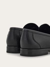 With a tapered tip and panted Gancio bit across the instep, this new Ferragamo loafer is most certainly uptown. The lizard printed calfskin confirms a high-end look, echoed by contrasting red stitching and an open channel leather sole. This shoe is made with the "Tubular" technique, an exclusive method applied by high end shoemakers, whereby the sole is hand-sewn to ensure a supple, flexible finish. - Composition: printed calfskin leather - Made in ITALY - Product code: 029457 778856