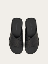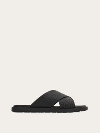 An absolute must for warm weather looks: the new Ferragamo sandal. The wide crossover straps are adorned with the iconic monogram all over, while light-padding ensures all-day comfort. Ultra-light rubber sole with custom tread. - Composition: calfskin - Made in ITALY - Product code: 029786 778782