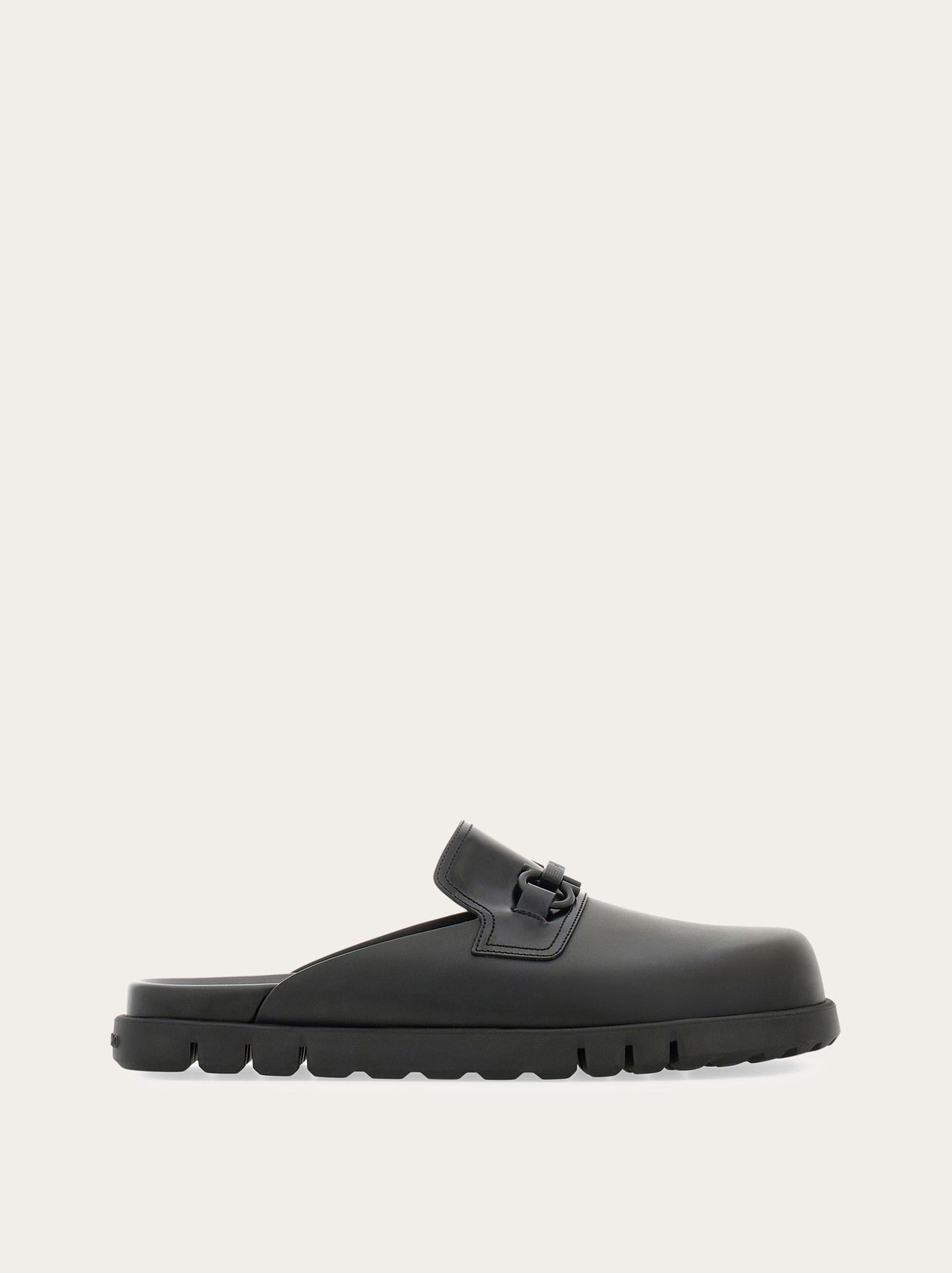 Round-toe mules featuring a plain calfskin upper and a tonal painted Gancini accent on the instep. The leather insole with a slightly anatomical shape is sports inspired, as is the ultra-lightweight rubber sole with a custom design. - Composition: calfskin - Product code: 027317 774016 - Made in ITALY