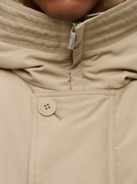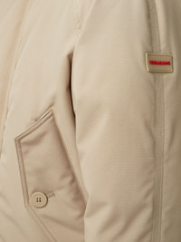 Outdoor style: bomber inspired padded blouson made of recycled cotton and polyester faille with waterproof coating. The relaxed, boxy fit confirms a contemporary feel, echoed by the large hood with central zip that drapes on the shoulder for a dramatic look. Hidden zip and top button fastening, knitted cuffs and button up belt straps and the wrists. Triple sports stitching along the sleeves. - Composition: 84% polyester, 16% cotton - Product code: 143632 770336 - Made in ITALY