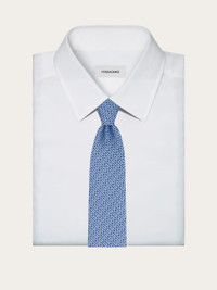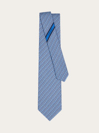 Pure silk tie featuring a pattern of interlocking Gancini laid over a regimental pattern in complementary shades. The layered look echoes the rich feel of this sophisticated accessory. - Composition: 100% silk - Made in ITALY - Product code: 351258 784212