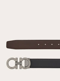A modern update on the timeless wardrobe staple – this Gancini belt is crafted from natural grained calfskin leather with a semi-matt finish. Notice the polished ruthenium-tone metal detail that lends it a chic touch. The adjustable length allows for a more personalized fit and style. We invite you to check our size guide for more information. - height 1.3 IN - Composition: textured calfskin - Made in ITALY - Product code: 679710 689134