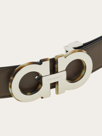 A modern update to the classic Ferragamo belt, featuring contrast stitching for a relaxed feel and a reversible two-tone design for ultimate versatility. The palladium-finish Gancini buckle is accented with a resin border in a tortoiseshell effect, adding a refined touch. The adjustable length allows for a more personalized fit and style. We invite you to check our size guide for more information. - height 1.2 IN - Composition: calfskin - Made in ITALY - Product code: 670460 786317