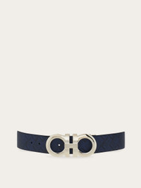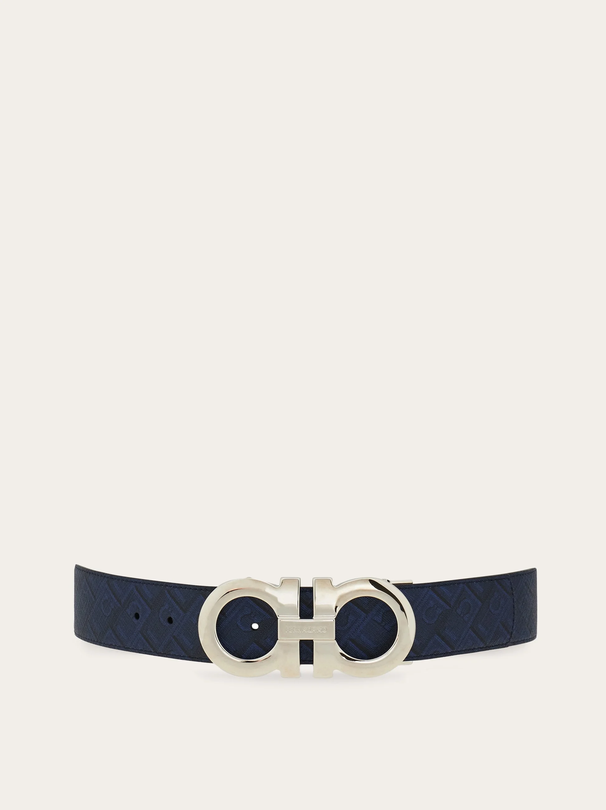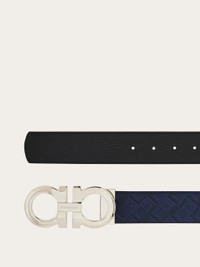 This reversible belt is crafted with calfskin on one side and coated fabric with a Ferragamo monogram print on the other. Its dual-tone design offers versatile styling, perfect for any occasion. It is decorated with a ruthenium-finish Gancini buckle. The adjustable length allows for a more personalized fit and style. We invite you to check our size guide for more information. - height 1.5 IN - Composition: calfskin and coated fabric - Made in ITALY - Product code: 670270 790551