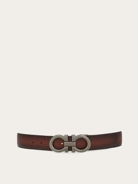 Keep it simple. This minimal look belt is the height of contemporary chic. Made of hammered calf leather, the strap is reversible for dual styling options. The ruthenium finish Gancini buckle sets off the look. The adjustable length allows for a more personalized fit and style. We invite you to check our size guide for more information. - height 1.3 IN - Composition: hammered calfskin - Made in ITALY - Product code: 679710 790353
