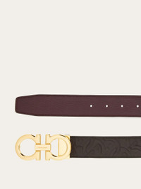 Versatility and a fashionable edge make this reversible belt a real must-have. Crafted from hammered calfskin on one side and an exquisite natural-grain leather on the other, it is complemented by the golden-finish Gancini buckle with a delicate satin detail on the interior. The adjustable length allows for a more personalized fit and style. We invite you to check our size guide for more information. Ferragamo. - height 1.3 IN - Composition: smooth and hammered calfskin - Made in ITALY - Product code: 679710 770651