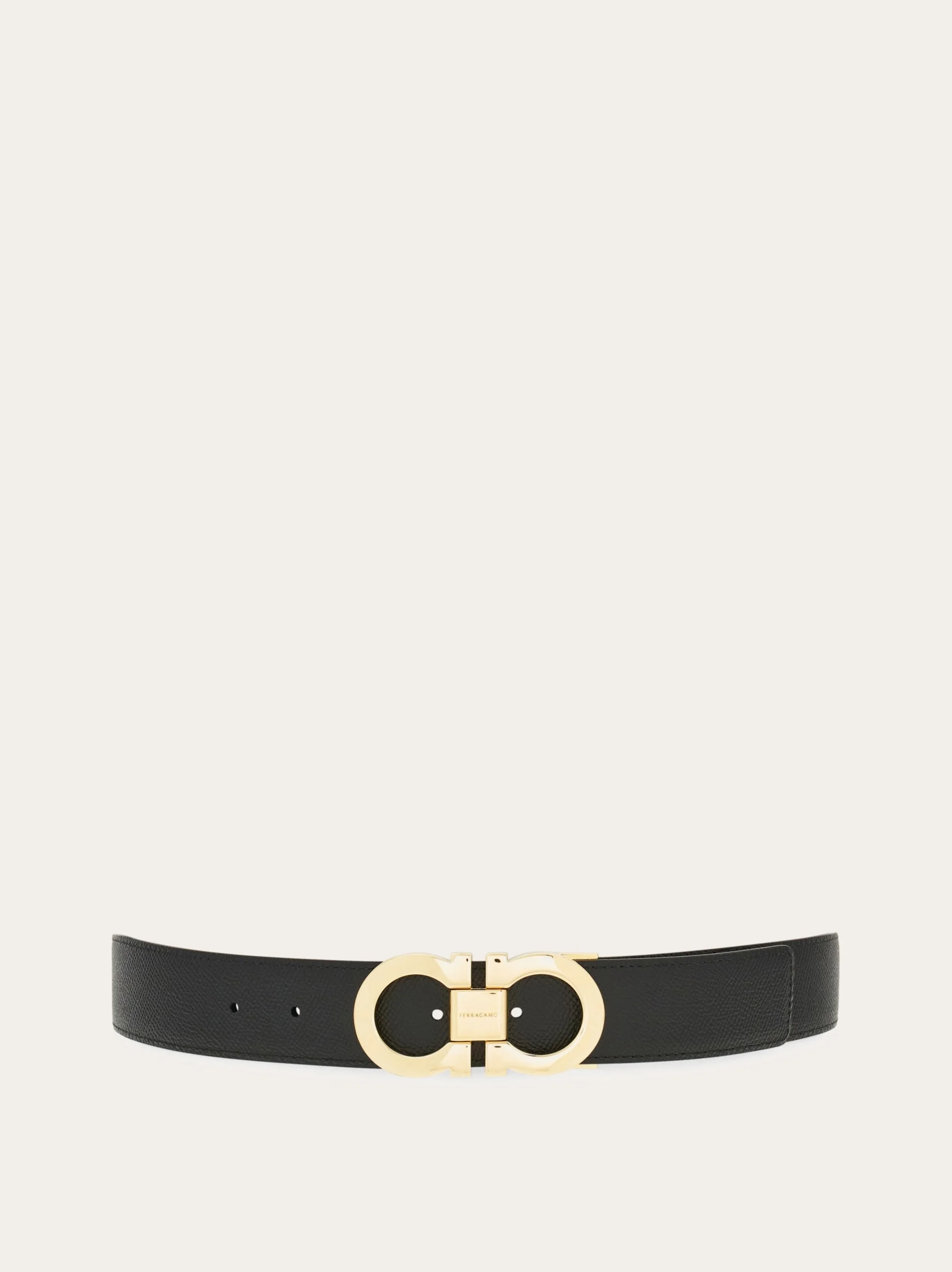Timeless yet contemporary, the golden glow of the Gancio buckle lights up this reversible Ferragamo belt. Made of hammered calfskin leather, the shaft is two-tone reversible for versatile styling. The length is adjustable. Please see the size guide for further details. - height 1.3 IN - Composition: hammered calfskin - Made in ITALY - Product code: 679535 780164