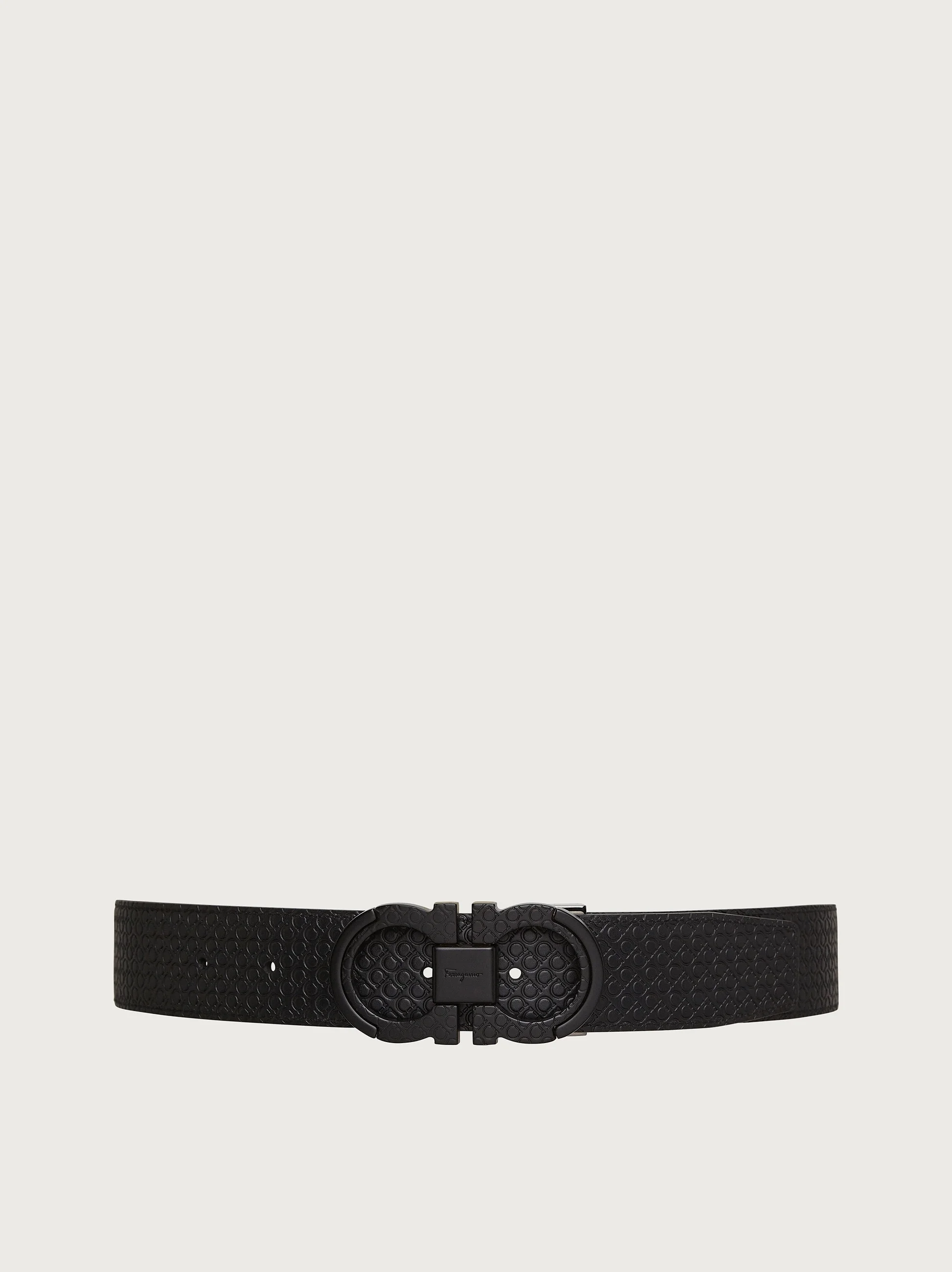 Contemporary mood and double styling, what's not to love?! This Italian calf leather belt in a total black hue is smooth on one side and embossed on the other with an all over Gancini pattern for a distinctive look. The adjustable length allows for a more personalized fit and style. We invite you to check our size guide for more information. - height 1.3 IN - Composition: calfskin - Made in ITALY - Product code: 670049 745872
