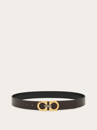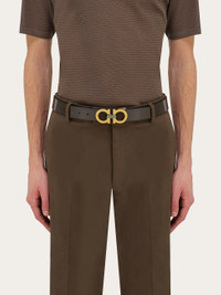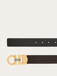 Timeless and refined, this reversible belt features contrasting shades on each side for ultimate versatility. The Gancini buckle, accented with a contrasting center detail, adds a distinctive touch. The adjustable length allows for a more personalized fit and style. We invite you to check our size guide for more information. - height 1.3 IN - Composition: calfskin - Made in ITALY - Product code: 670391 785965
