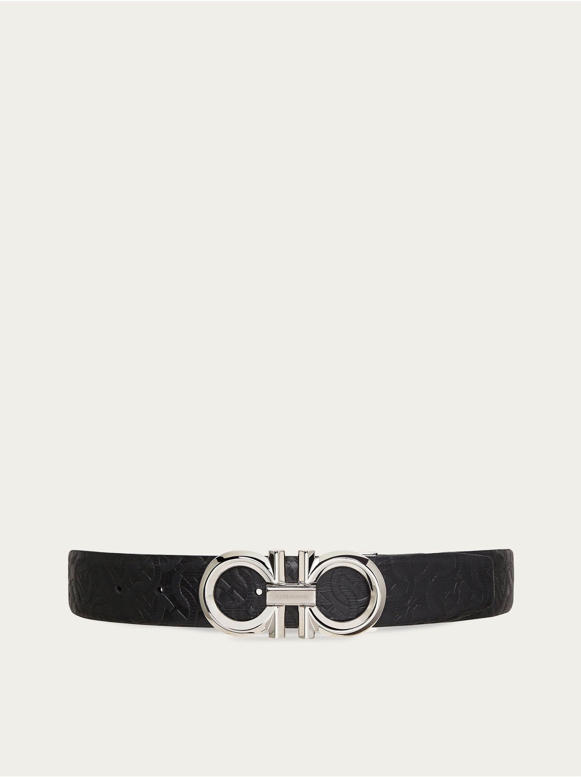 Elegant and iconic, made in Italy. This reversible belt offers multiple styling options, thanks to the dual tone strap in contrasting textures. One side features smooth calf leather, while the other has an all over embossed Gancini pattern for a refined look. The palladium finish buckle features a double Gancini with a diamond profile, for a luminous look. The adjustable length allows for a more personalized fit and style. We invite you to check our size guide for more information. - height 1.3 IN - Composition: calfskin - Reversible and adjustable belt with detachable buckle - Made in ITALY - Product code: 679939 746527
