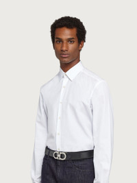 Reversible two-tone belt, made of calf leather, with visible stitching along the shaft for an informal feel. The Gancini buckle is made in a ruthenium finish with a special knurled processing on the base of the double Gancios, and a smooth, square plate in the center with the iconic signature. The adjustable length allows for a more personalized fit and style. We invite you to check our size guide for more information. - height 1.3 IN - Composition: calfskin - Made in ITALY - Product code: 670084 750184