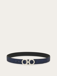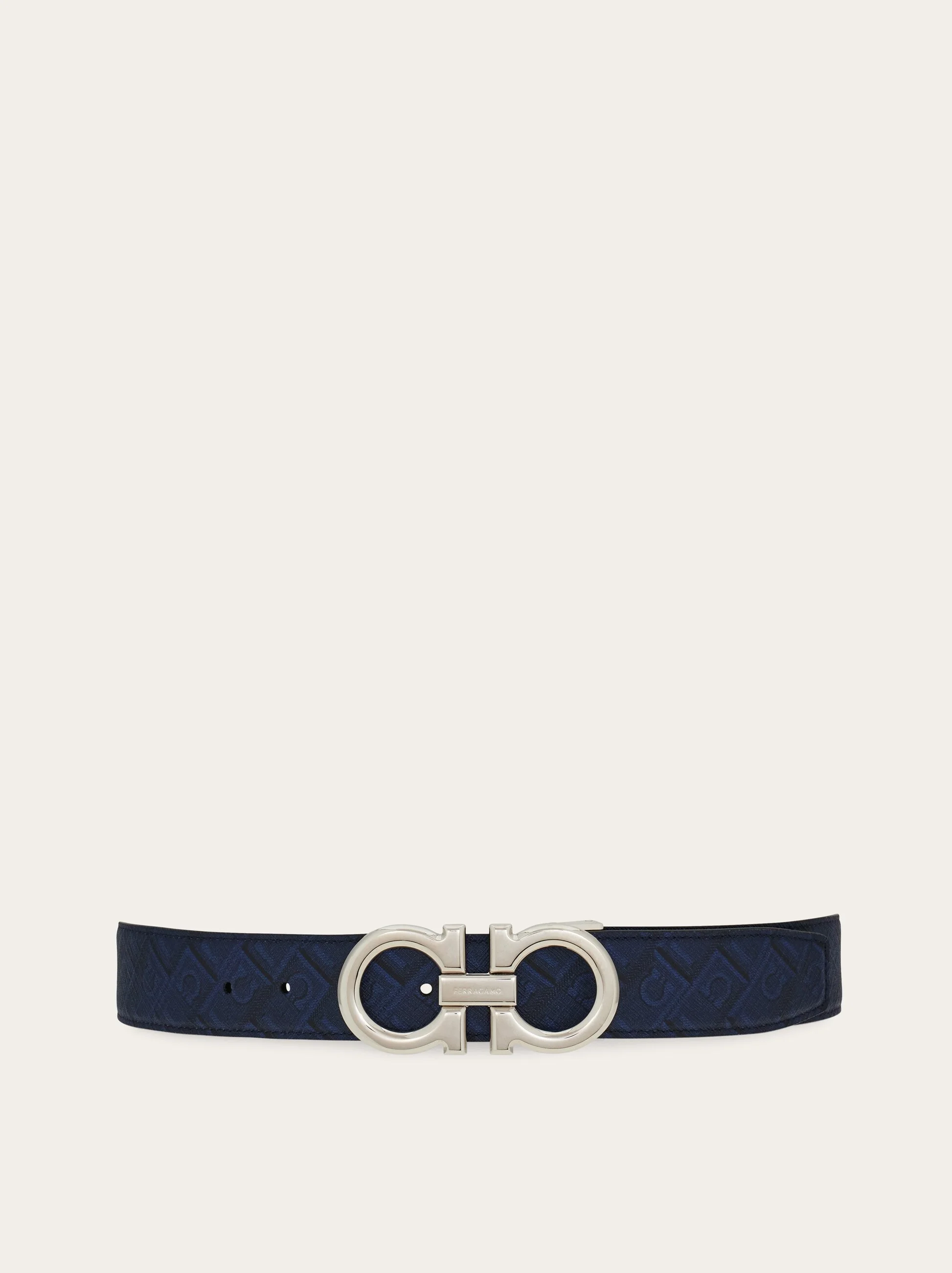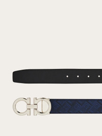 Reversible and dual-toned, this belt features one side in smooth calfskin and the other in coated fabric adorned with the Ferragamo Monogram pattern. The double Gancini buckle lends an unmistakable iconic flair. The adjustable length allows for a more personalized fit and style. We invite you to check our size guide for more information. - height 1.3 IN - Composition: calfskin and coated fabric - Made in ITALY - Product code: 679710 790394