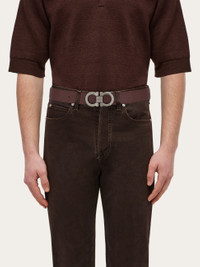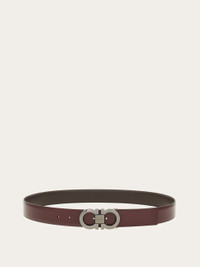 Elegant belt made from richly textured calfskin, featuring a reversible and two-tone design for ultimate versatility. The Gancini buckle in satin-finish palladium is enhanced by a central square plaque with an engraved signature. The adjustable length offers a personalized fit and style. Please refer to our size guide for more details. - height 1.3 IN - Composition: calfskin - Reversible and adjustable belt with detachable buckle - Made in ITALY - Product code: 679535 778226