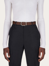 Contemporary elegance with a casual edge: a new belt crafted from soft hammered calfskin, with a stitched strap and reversible two-tone construction for many styling options. The palladium-finish Gancini buckle and the custom metal belt loop completes the design with an iconic edge. This adjustable-length model offers a personalized fit and style. Easily cut the belt strap or punch another hole for a tighter or looser fit. A customization service is also available in all Ferragamo boutiques. - height 30.0 CM / 11.8 IN - Composition: hammered calfskin - Product code: 670302 771976 - Made in ITALY