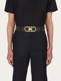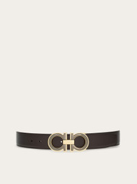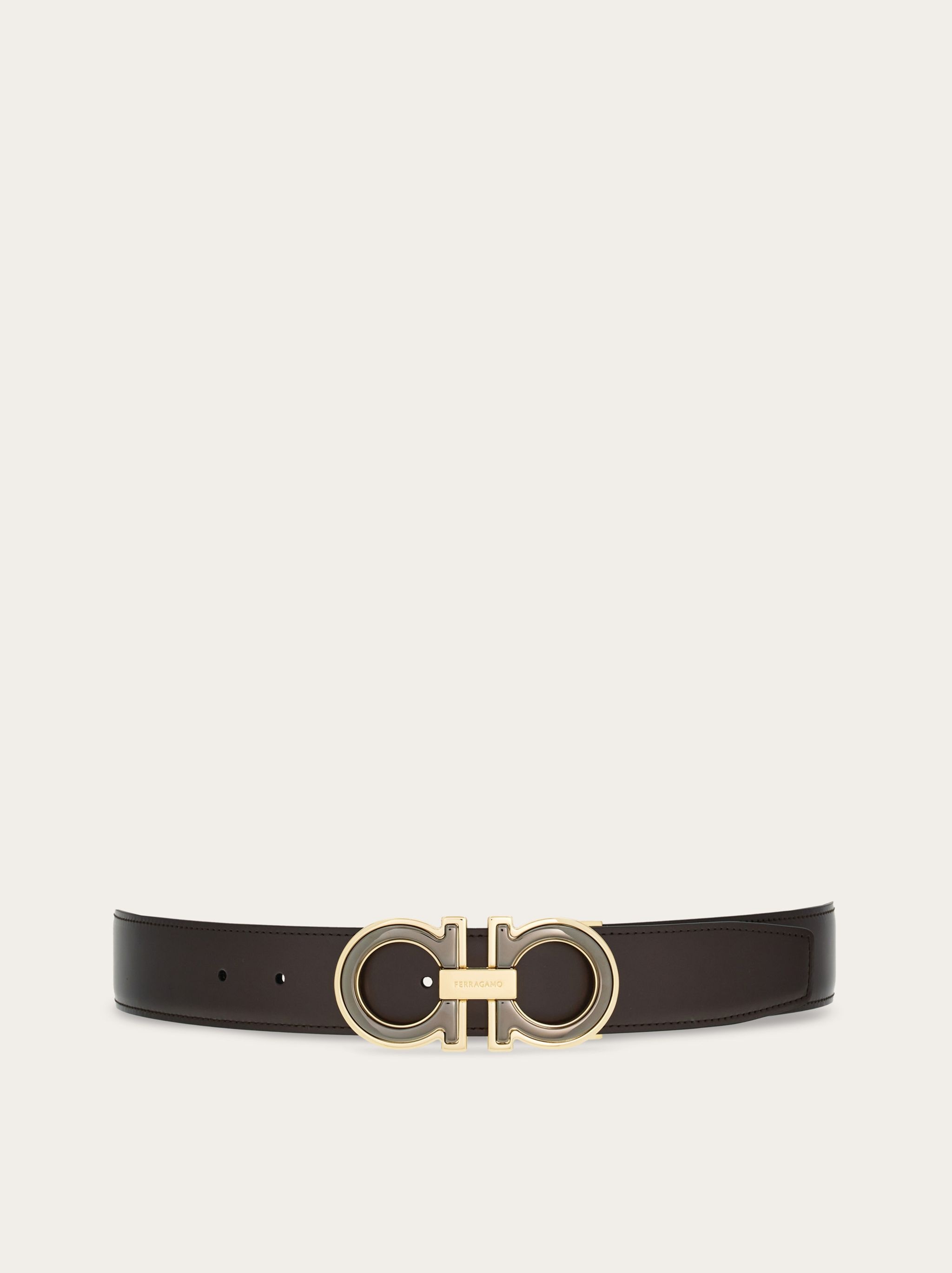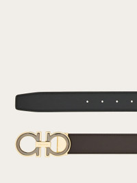 An iconic symbol of the brand, the double-layer Gancini detail becomes an elegant buckle with a contemporary edge. This belt is crafted from smooth calfskin on both sides, with a two-tone design for versatility and a look you can personalize at all times. Reversible, two-tone construction for two ways of wearing it and an adjustable length. Adjustable length. Easily cut the belt strap or punch another hole for a tighter or looser fit. A customization service is also available in all Ferragamo boutiques. - height 3.5 CM / 1.3 IN - Composition: calfskin - Product code: 67A254 771992 - Made in ITALY