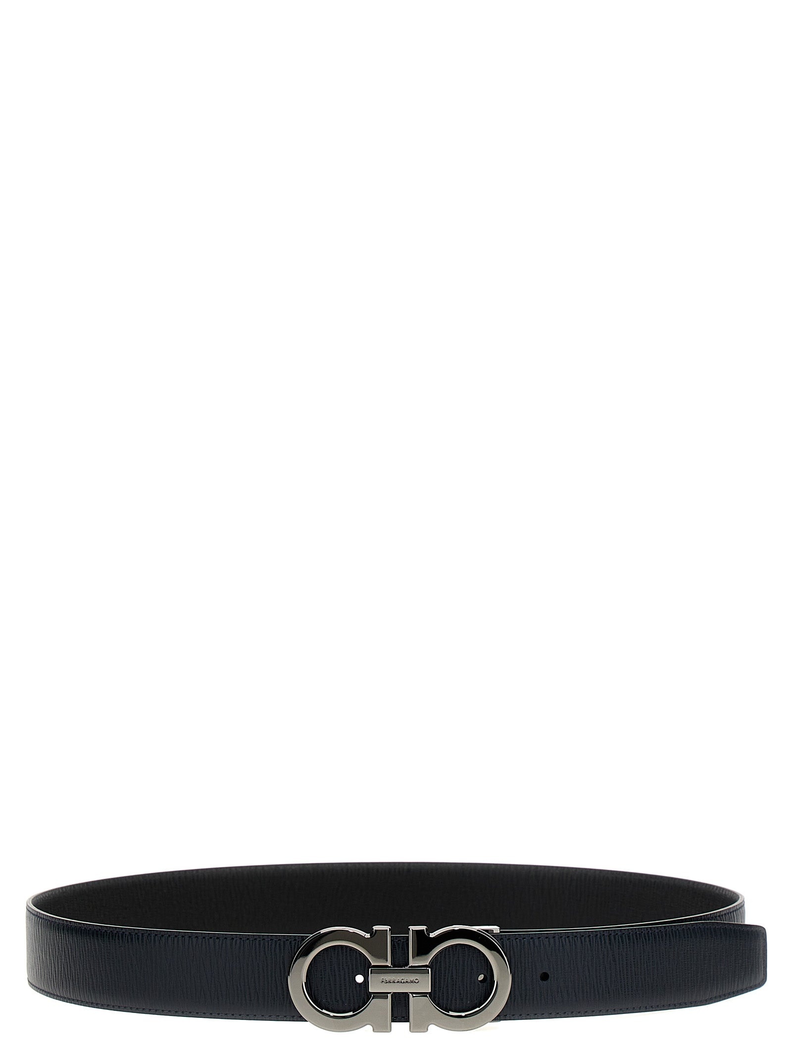 Black and blue hammered leather reversible belt, metal 'Gancini' buckle. FERRAGAMO 'Gancini' reversible belt H 3.5 cm