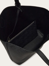 Made of hammered calfskin leather, this cool new Ferragamo tote features the cleanest lines, with simple details. The reversible construction is lined with the Ferragamo monogram on the inside, for a bold look with an iconic twist, while the leather side is embossed with a small logo between the long top handles. A handy removable clutch is placed on the inside. - height 14.1 IN length 12.9 IN width 4.7 IN - Composition: hammered calfskin and fabric - Made in ITALY - Product code: 241680 779428